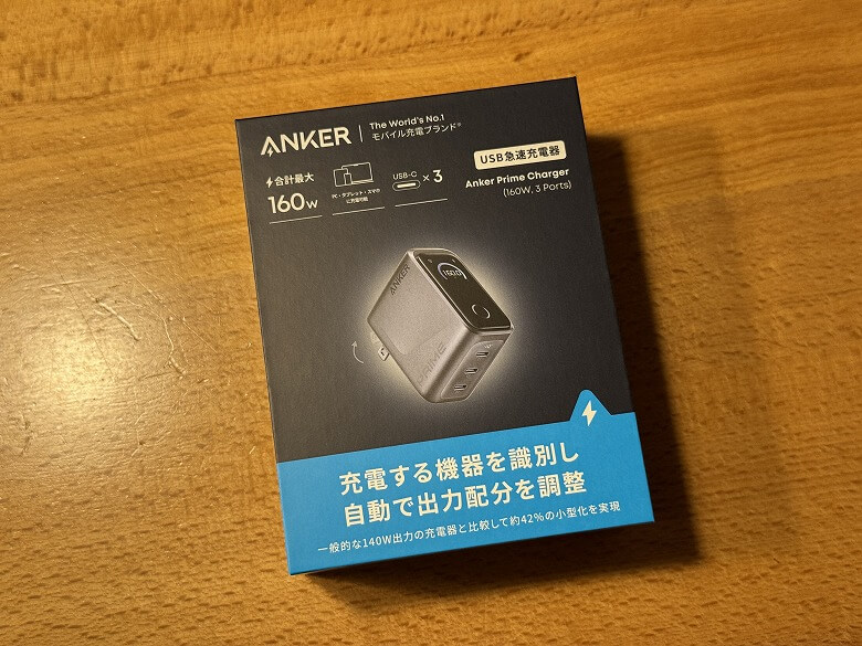 「Anker Prime Charger (160W, 3 Ports)」の外箱は、黒基調で青色をアクセントにしたクールなデザインです。