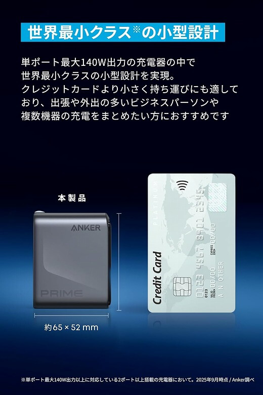 「Anker Prime Charger (160W, 3 Ports)」は単ポート最大140W出力の充電器の中で、世界最小クラスの小型設計を実現しています。