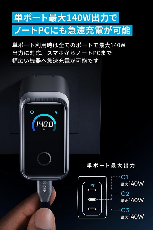 単ポート最大140W出力でノートPCにも急速充電が可能です。