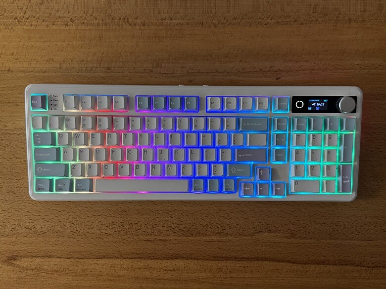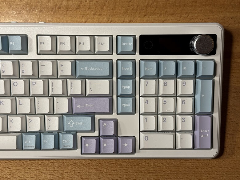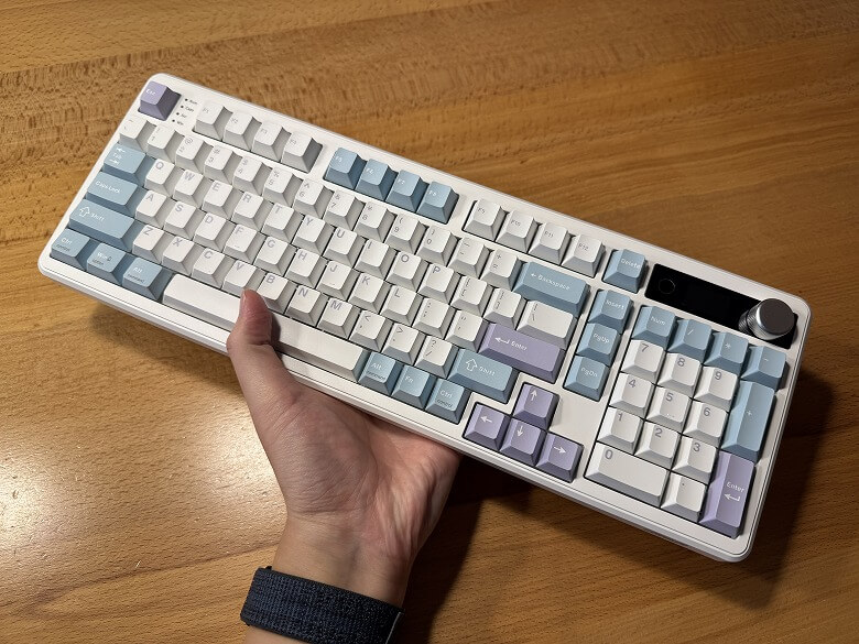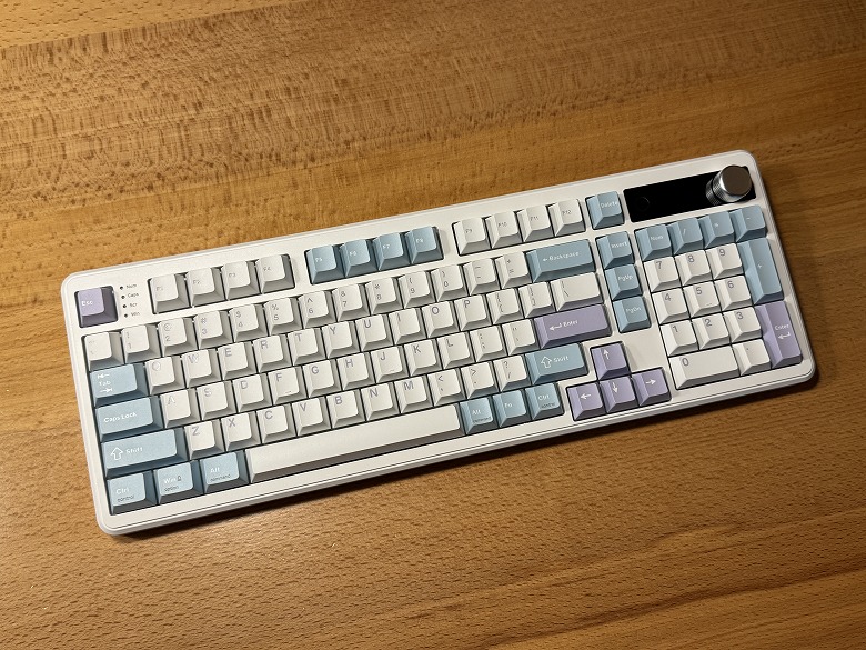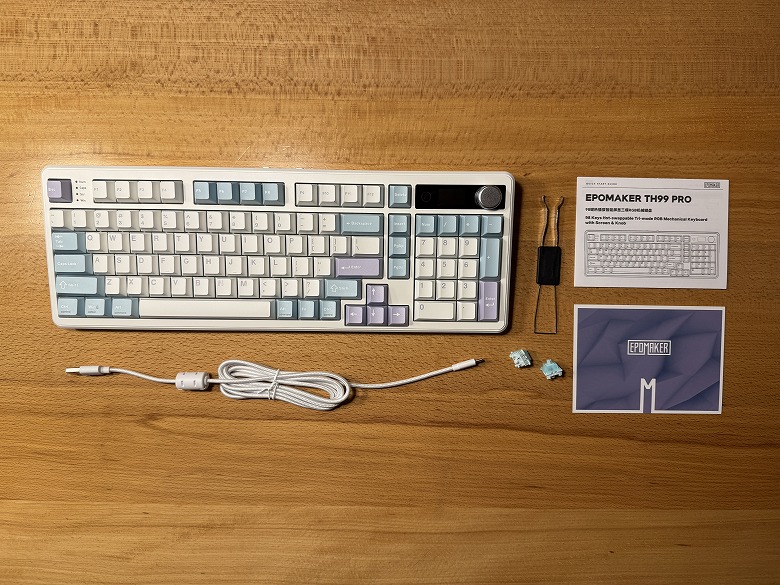 「Epomaker TH99 Pro」の外観は、白基調でアクセントカラーにブルーやパープルを採用したレポップなデザインです。