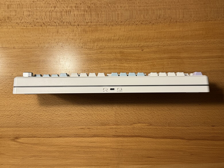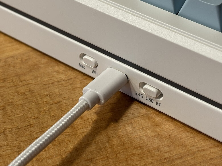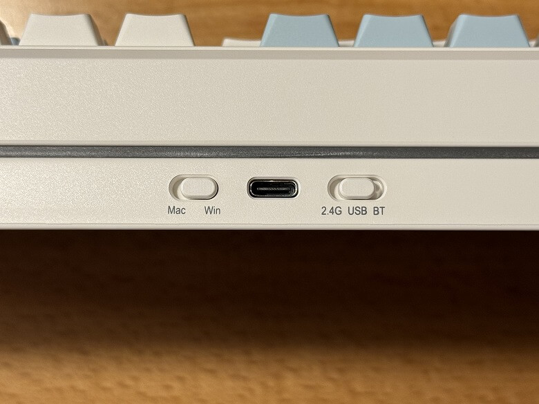 背面中央にはUSB Type-CポートとWin/Mac切替スイッチ、2.4G/USB/BTスイッチがあります。