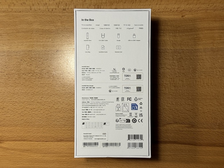 「Insta360 Wave」の外箱は、白基調で製品の写真がプリントされたシンプルなデザインです。