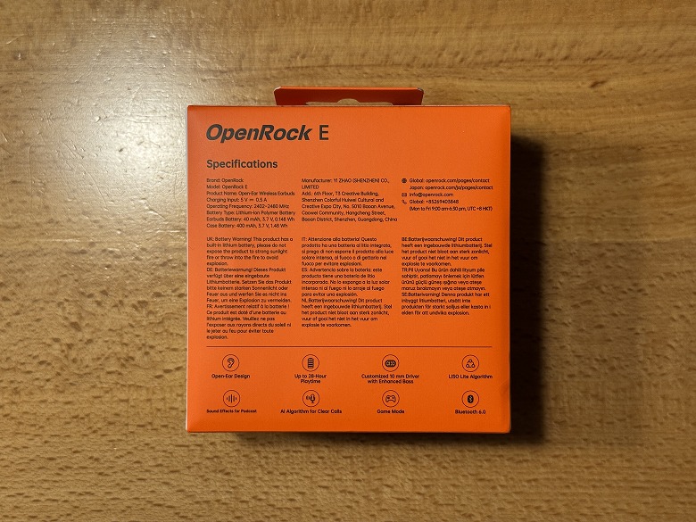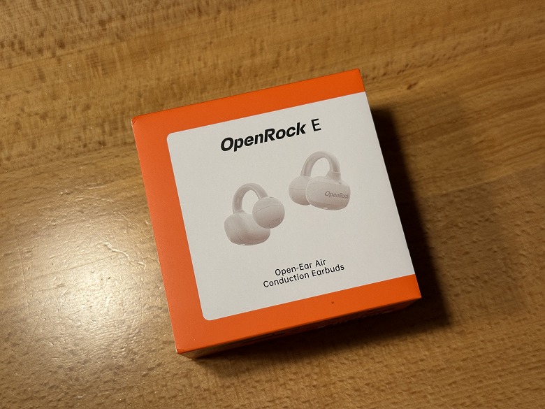 OneOdio OpenRock E」の外箱は、白基調でアクセントカラーがオレンジ色のポップなデザインです。