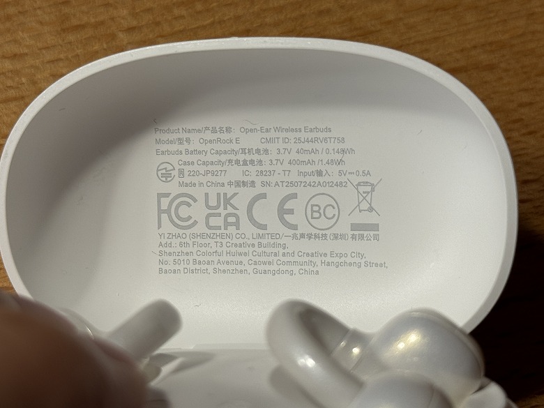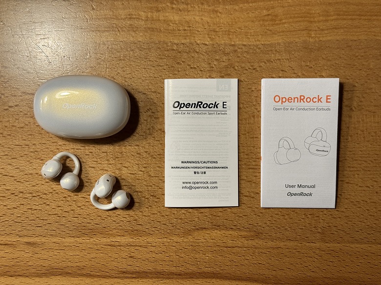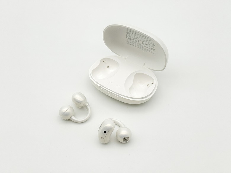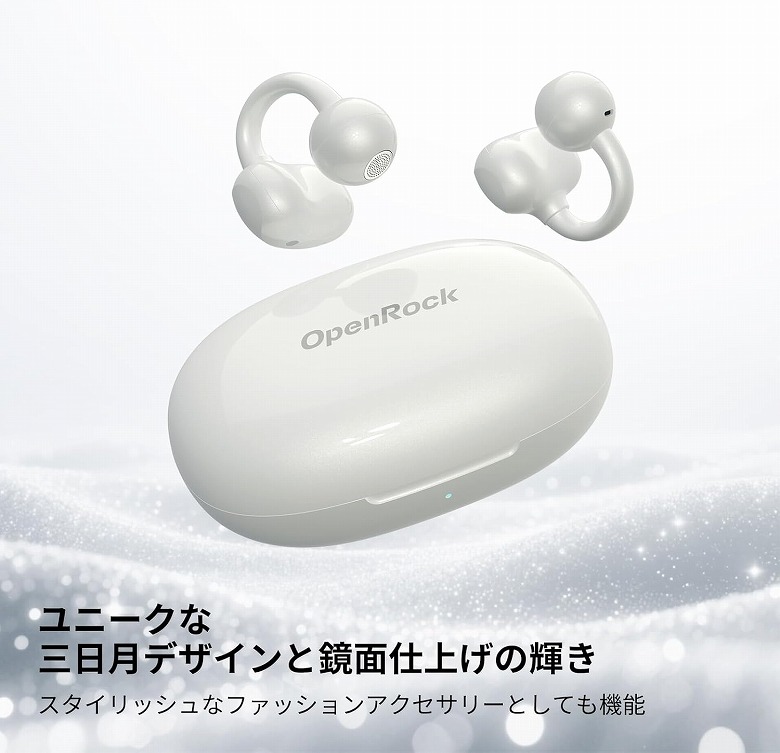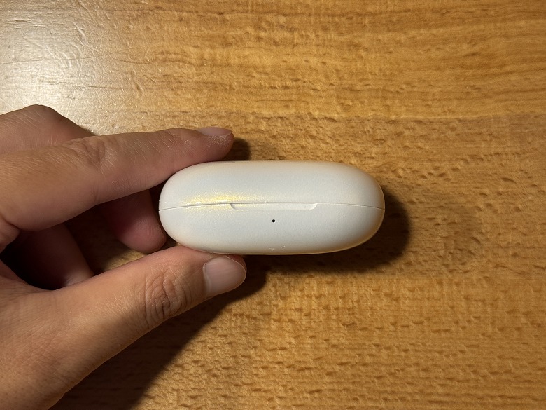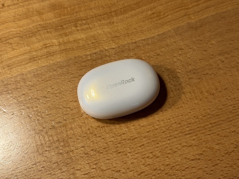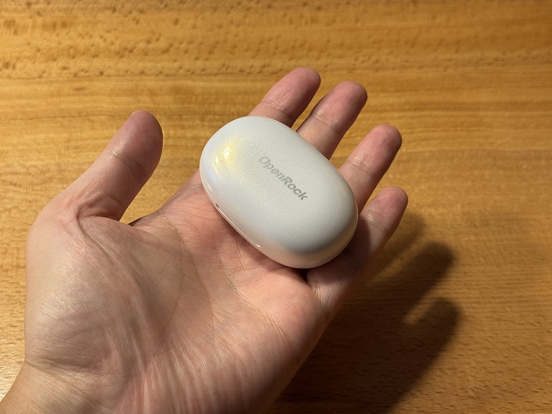 OneOdio OpenRock E」の充電ケースはホワイトメタリックで、可愛くも高級感のデザインです。