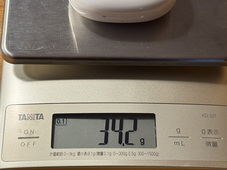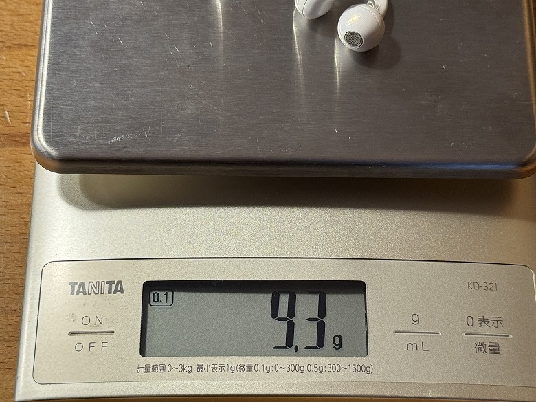 重さは充電ケースが34.2 g、イヤホンが9.3 g(片方4.65 g)でした。