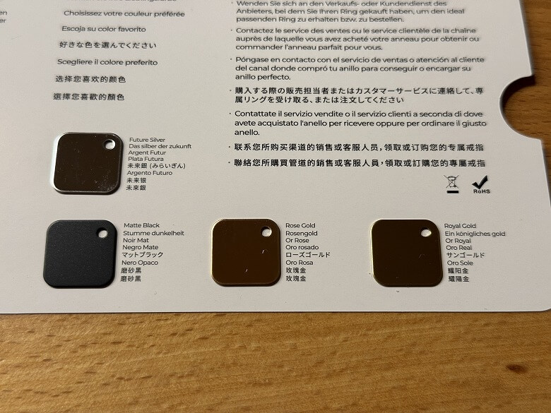 リングの他に素材のシートが貼られているので、これで色味や質感を確認できます。
