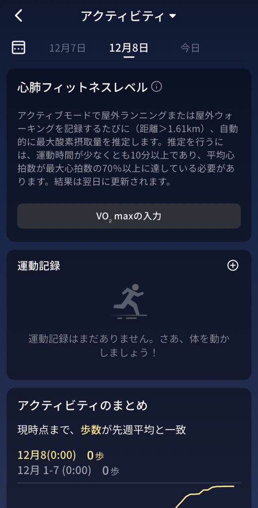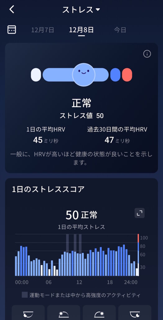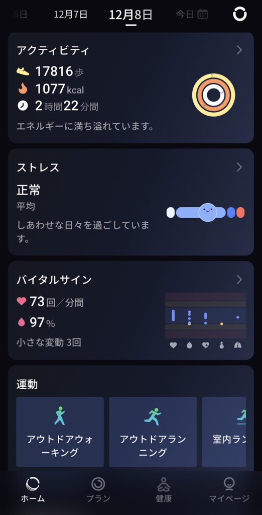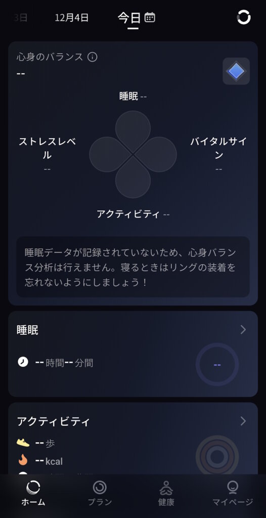 「RingConn Gen 2」を装着しデータが取得されると、ホーム画面にアクティビティやストレスなどの状態が表示されます。