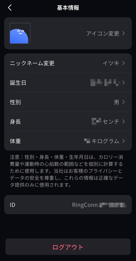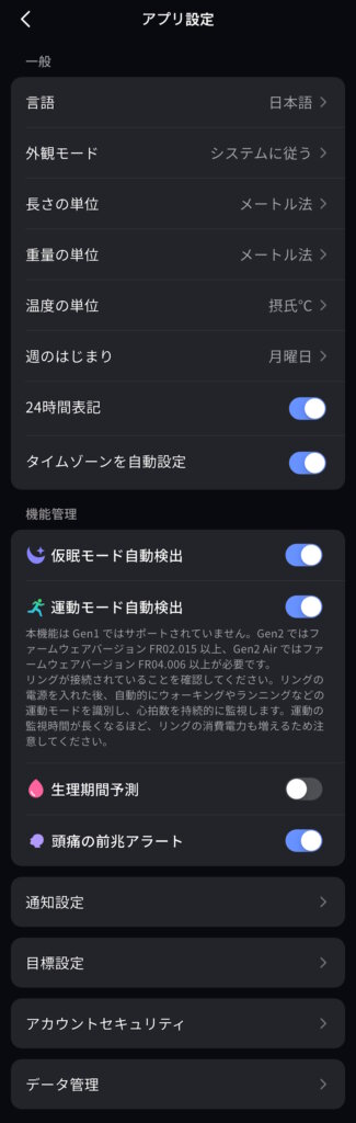 ユーザー情報やリングの設定、健康アラートなどを確認・設定できます。