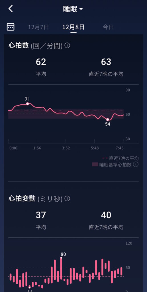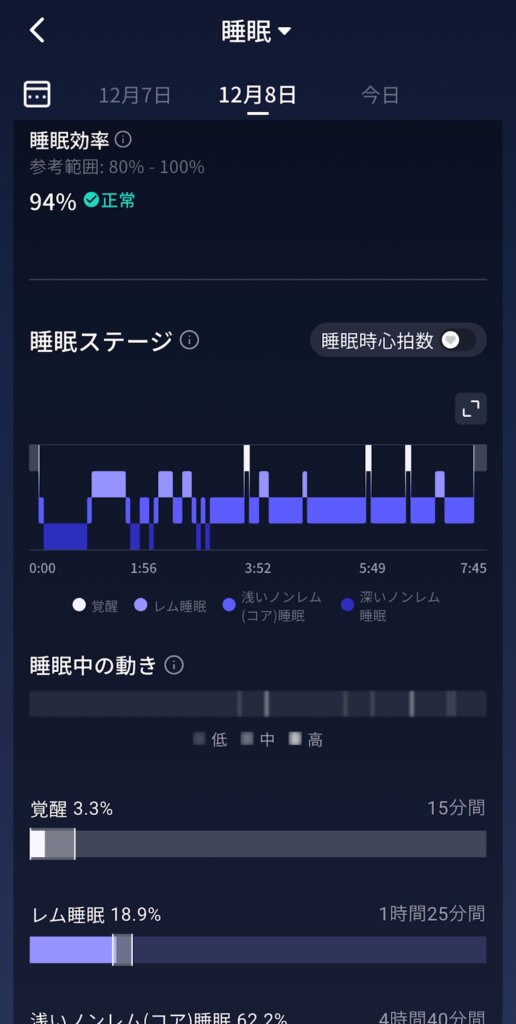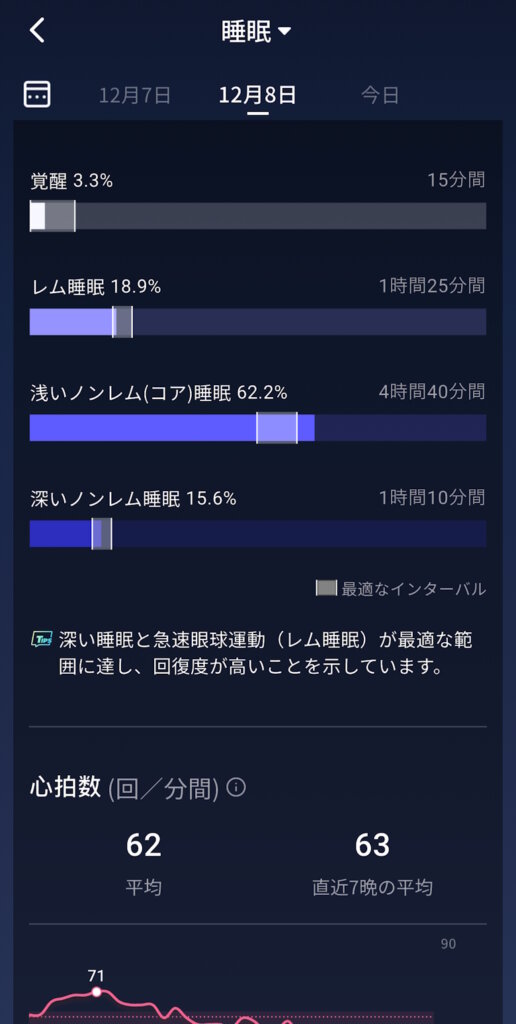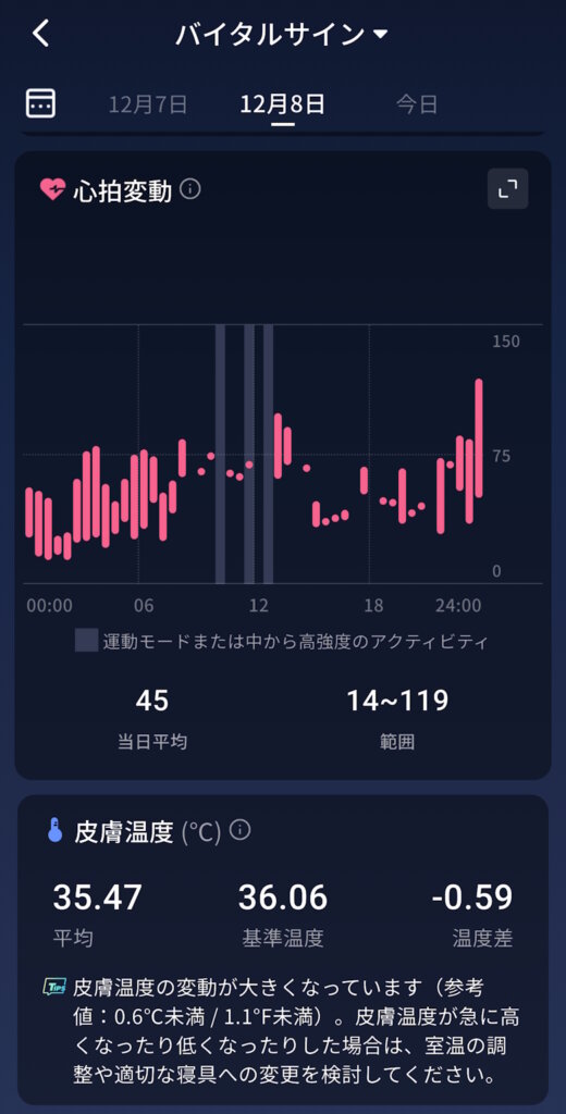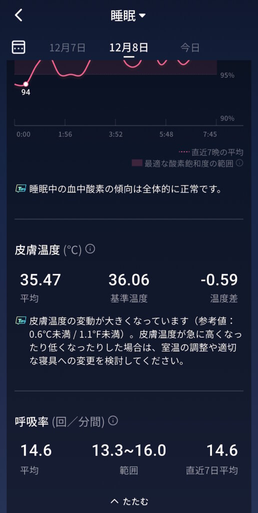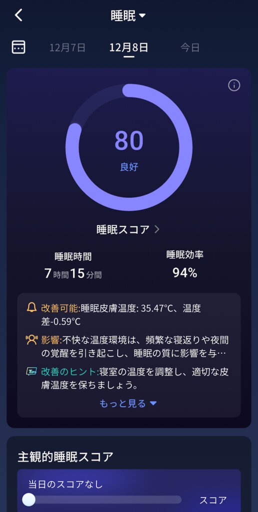 取得された睡眠データはスコアや睡眠ステージ、心拍数や皮膚温度など各項目を詳細に確認できます。