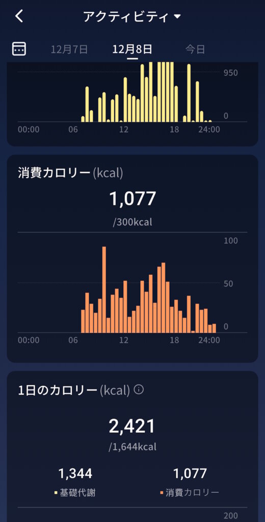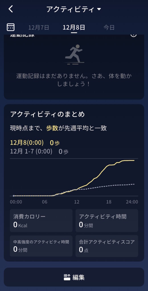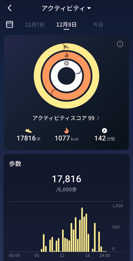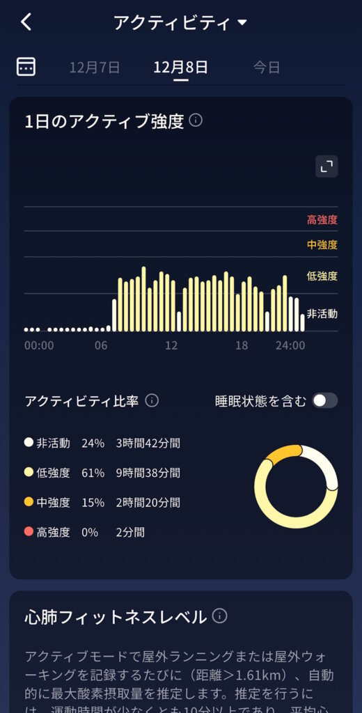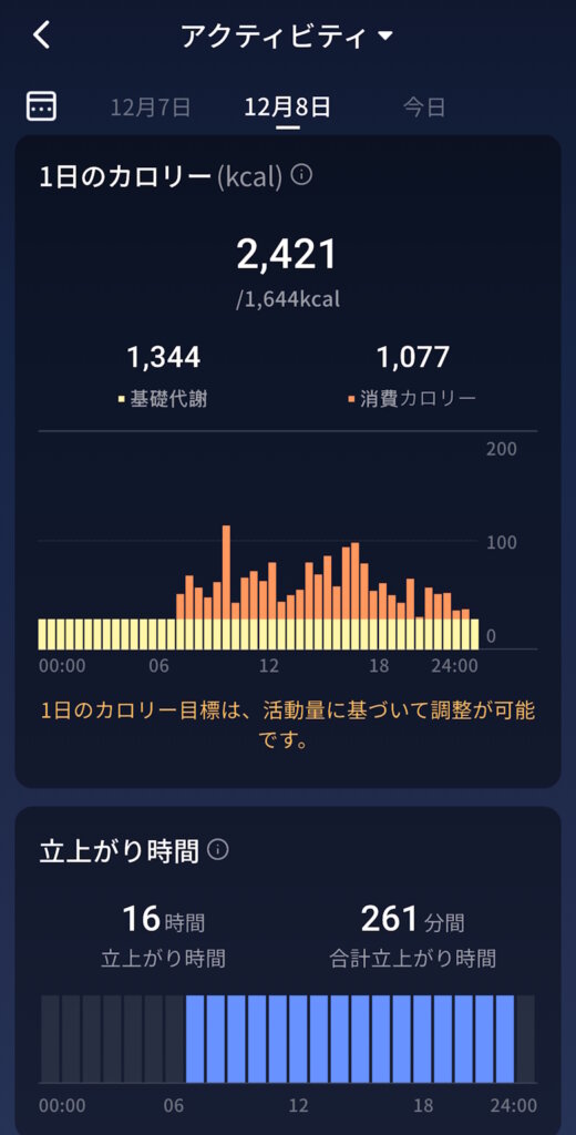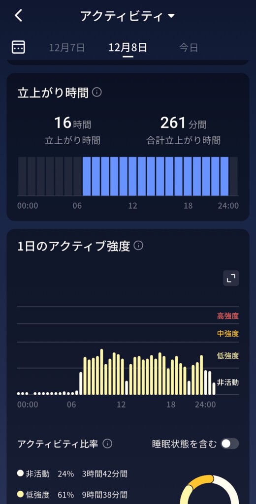 取得されたアクティビティデータは歩数や消費カロリー、立ち上がり時間やアクティブ強度など各項目を詳細に確認できます。