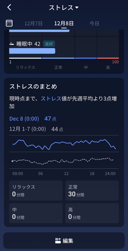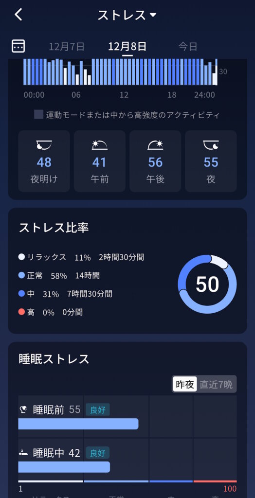 取得されたストレスデータはスコアやストレス比率、睡眠ストレスなど各項目を詳細に確認できます。