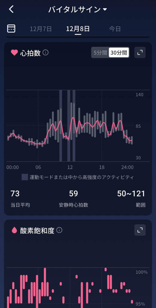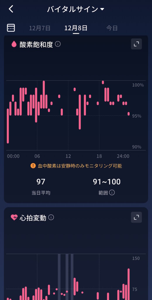 取得されたバイタルサインは心拍数や酸素飽和度、心拍変動など各項目を詳細に確認できます。