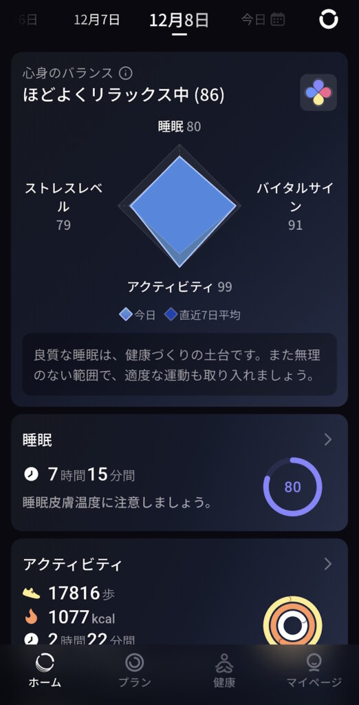 計測データも生活改善のヒントとして十分役立ち、普段の健康状態を「無理なく可視化したい」という人には相性の良いデバイスだと感じます。