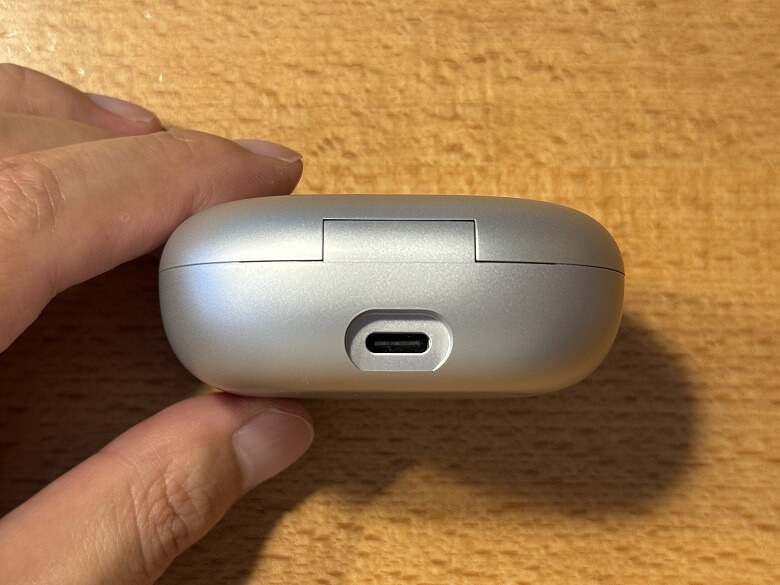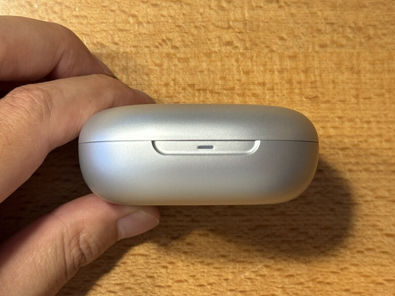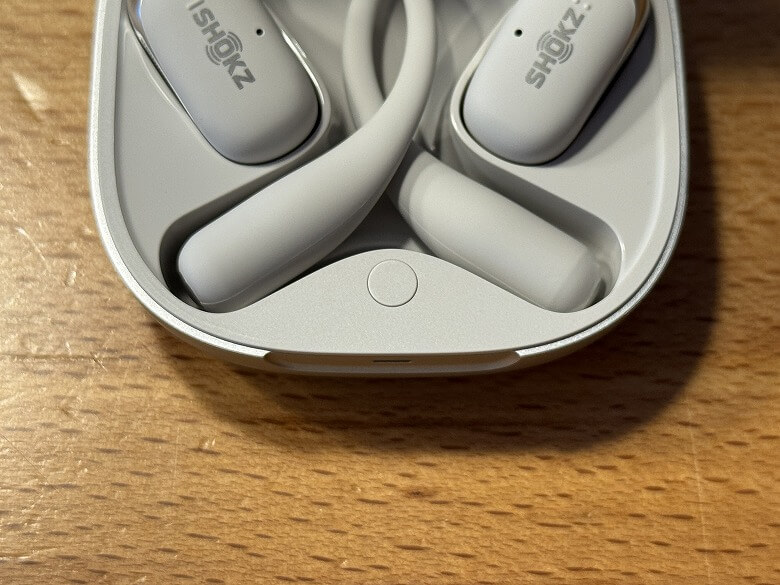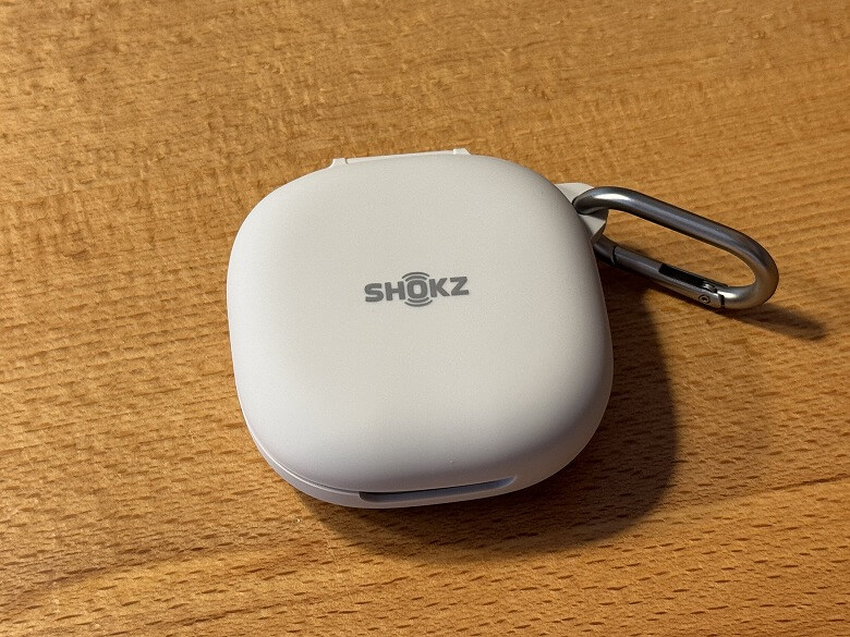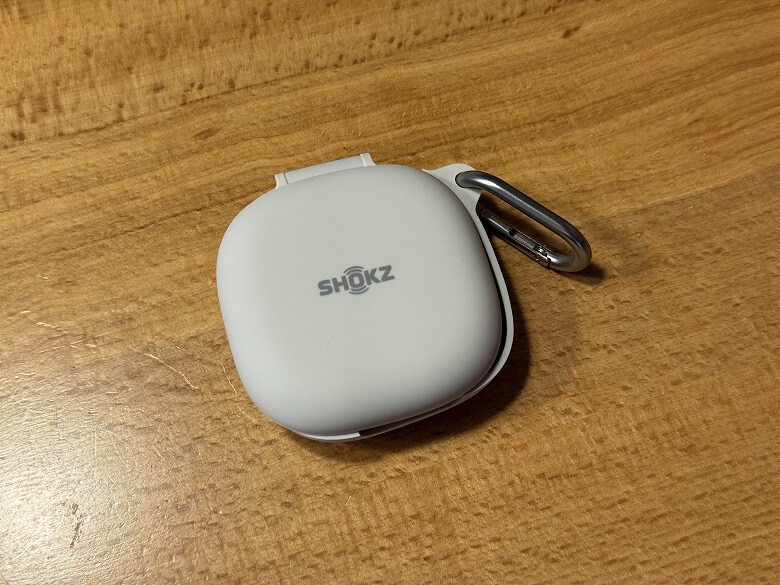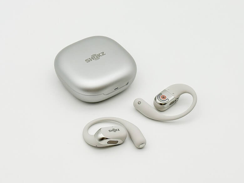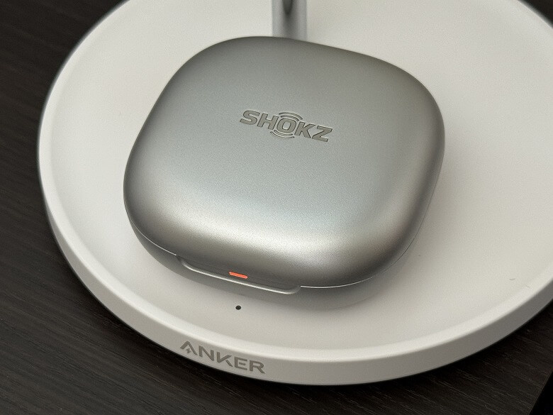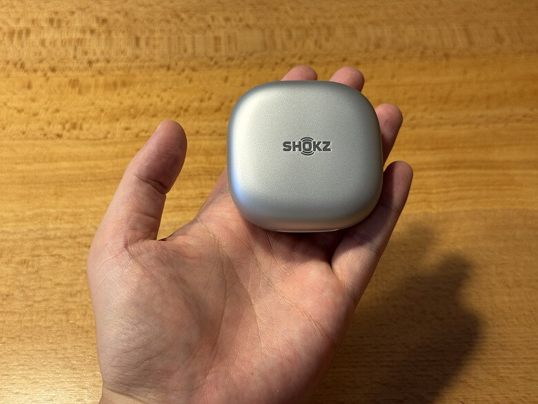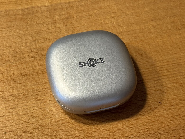 Shokz OpenFit 2+」の充電ケースは、シルバーメタリックでクールなデザインです。