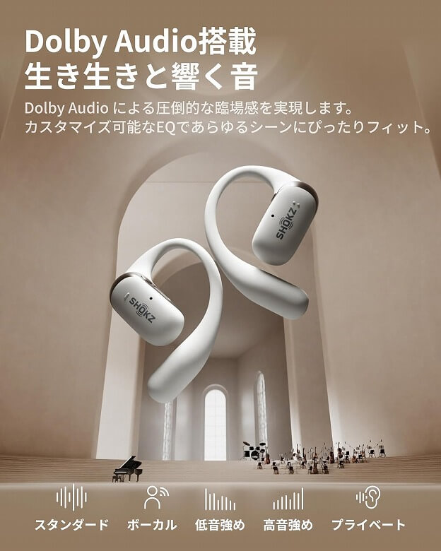 耳をふさがない快適な装着感、Dolby Audio対応による臨場感あるサウンド、そしてワイヤレス充電や最大48時間の再生時間といった機能性。