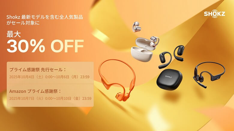 ショックス・ジャパン株式会社(Shokz Japan)は、2025年10月7日(火)0:00〜10月10日(金)23:59に開催される「Amazonプライム感謝祭」にて、最新モデルを含む人気製品を最大30%OFFで販売いたします。