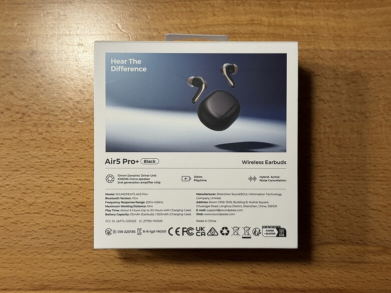 「SOUNDPEATS Air5 Pro+」の外箱は、白を基調としたシンプルなデザインです。