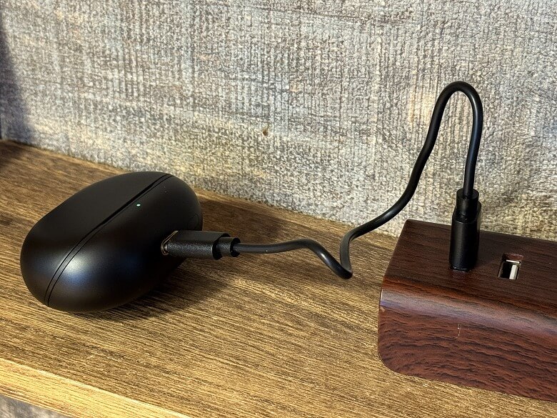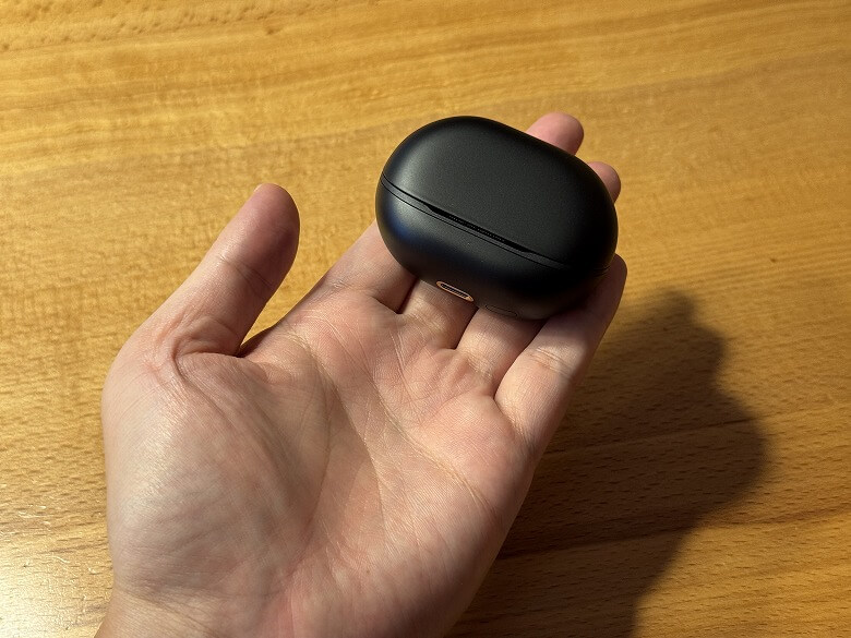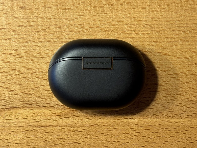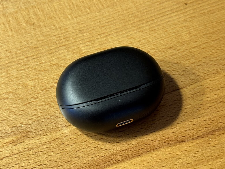 充電ケースの外装はマットな黒で、シンプルなデザインです。
