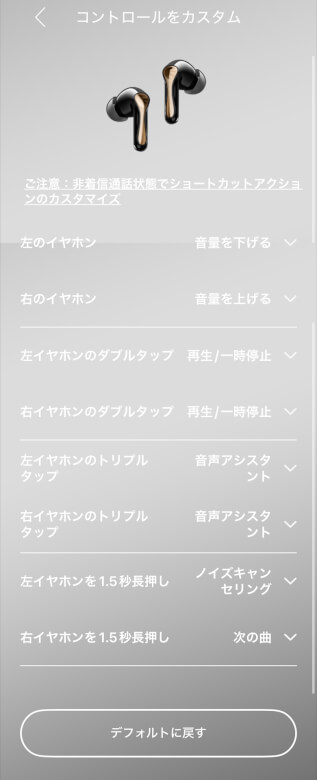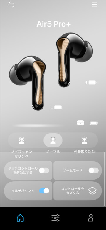ホーム画面では、ノイズキャンセリングの選択やタッチコントール無効など設定できます。