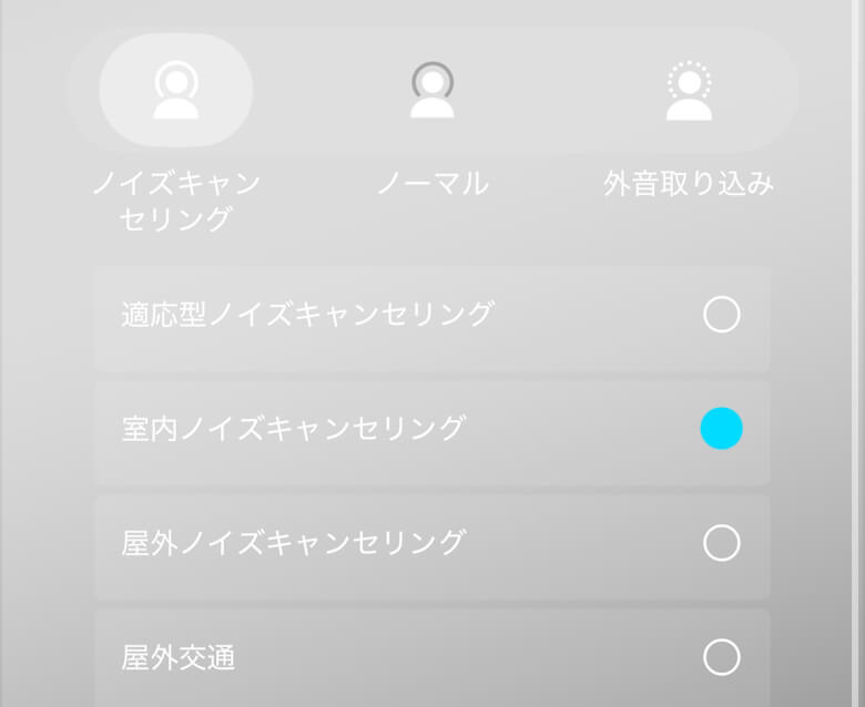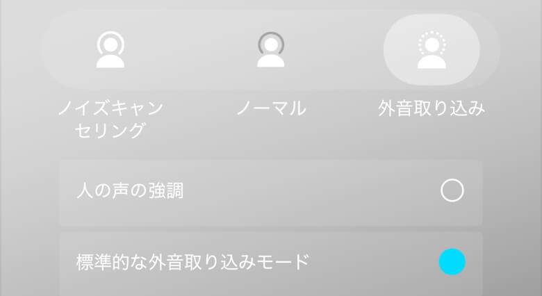 ノイズキャンセリングの種類や外音取り込みもモードを選択できます。