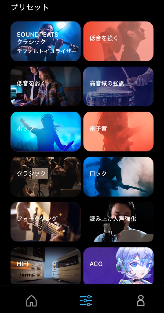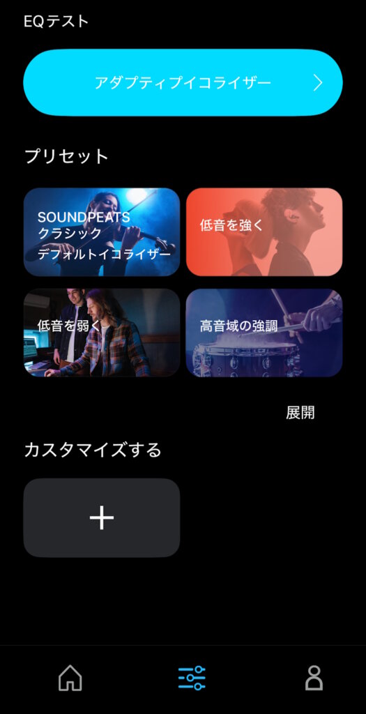 イコライザーではプリセットからの選択や聴覚テストによるカスタマイズが可能です。