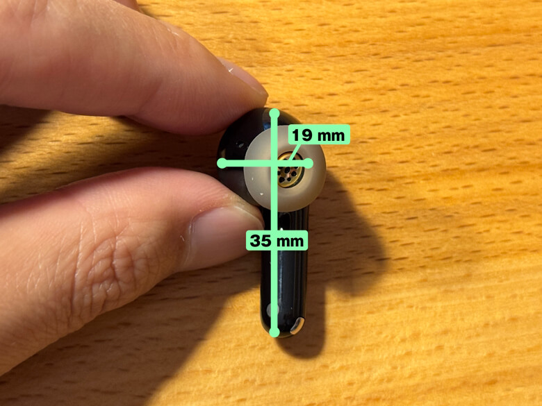 イヤホンの全長は35 mm、横幅は16 mmです。