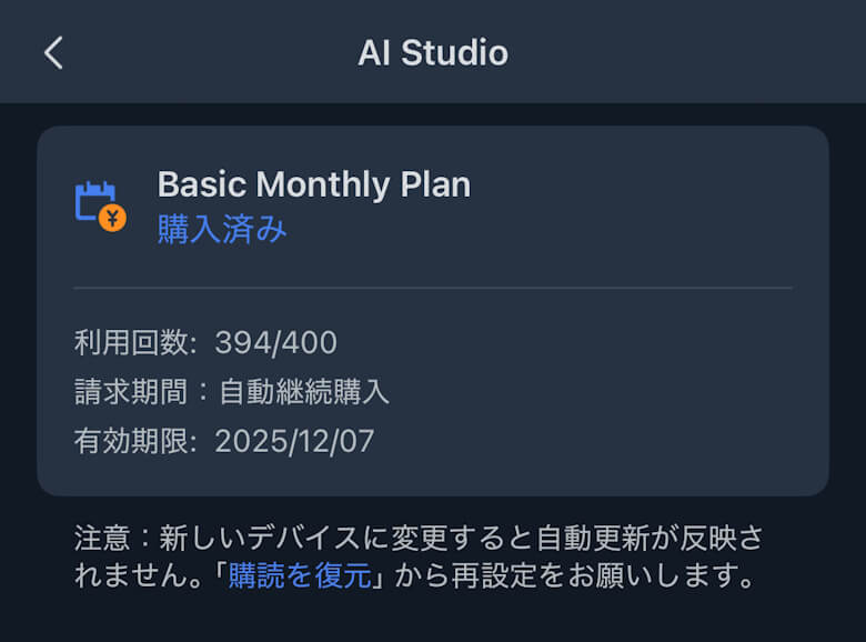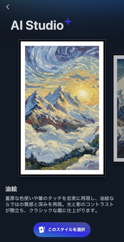 AI Studioでは「AI画像生成」「AIスタイル変換」の2つを選択できます。