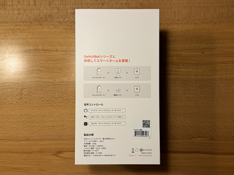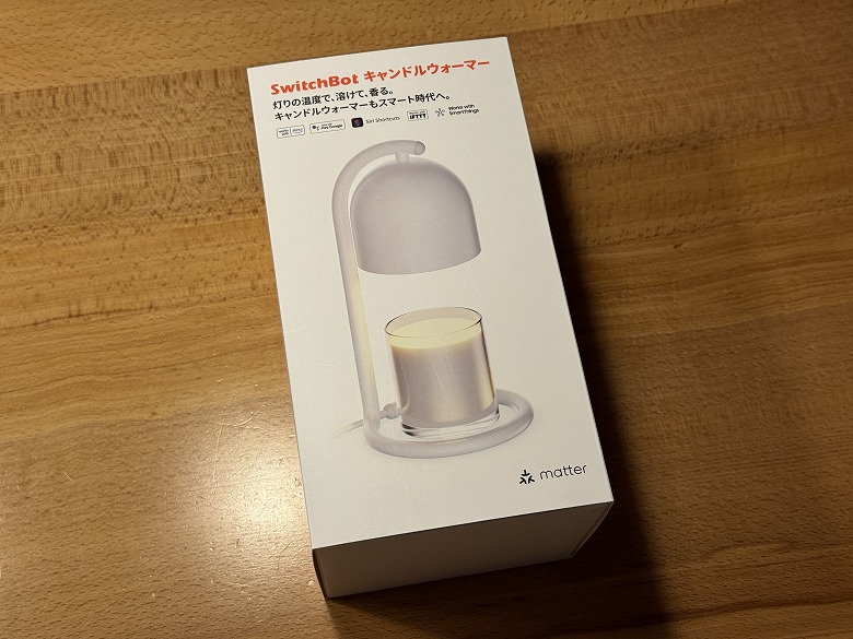 「SwitchBot キャンドルウォーマー」の外箱は、白基調でシンプルなデザインです。