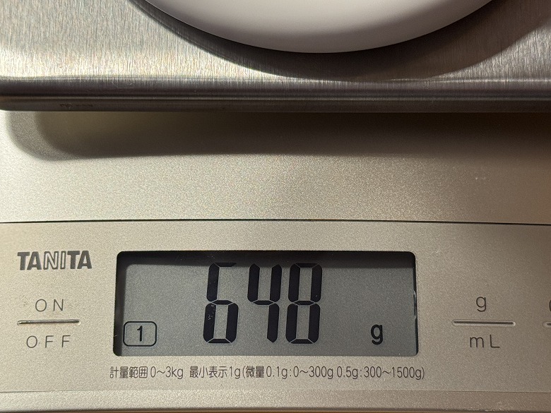 重さは648 g(電源ケーブル+コントローラー込)でした。