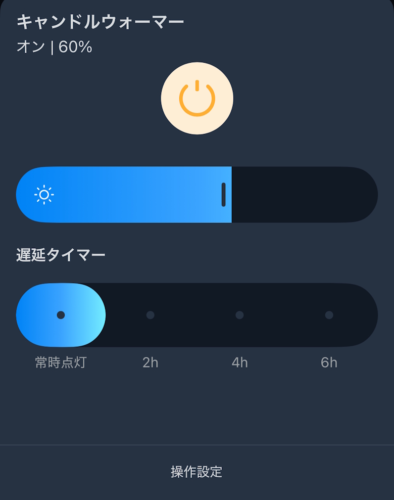 アプリのホーム画面では電源ON/OFFや調光、遅延タイマーを設定できます。