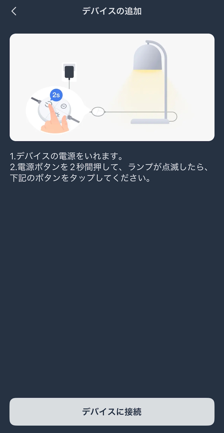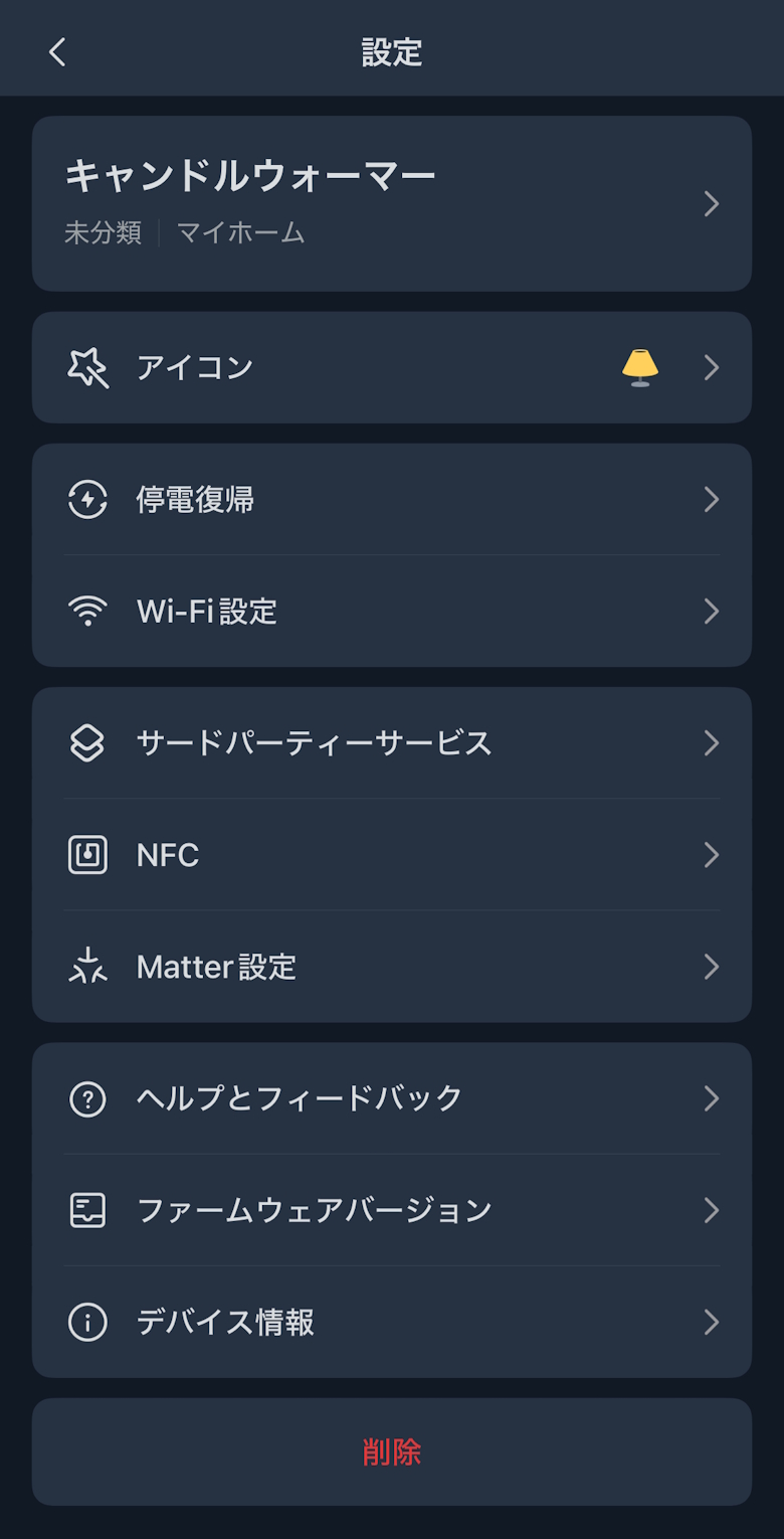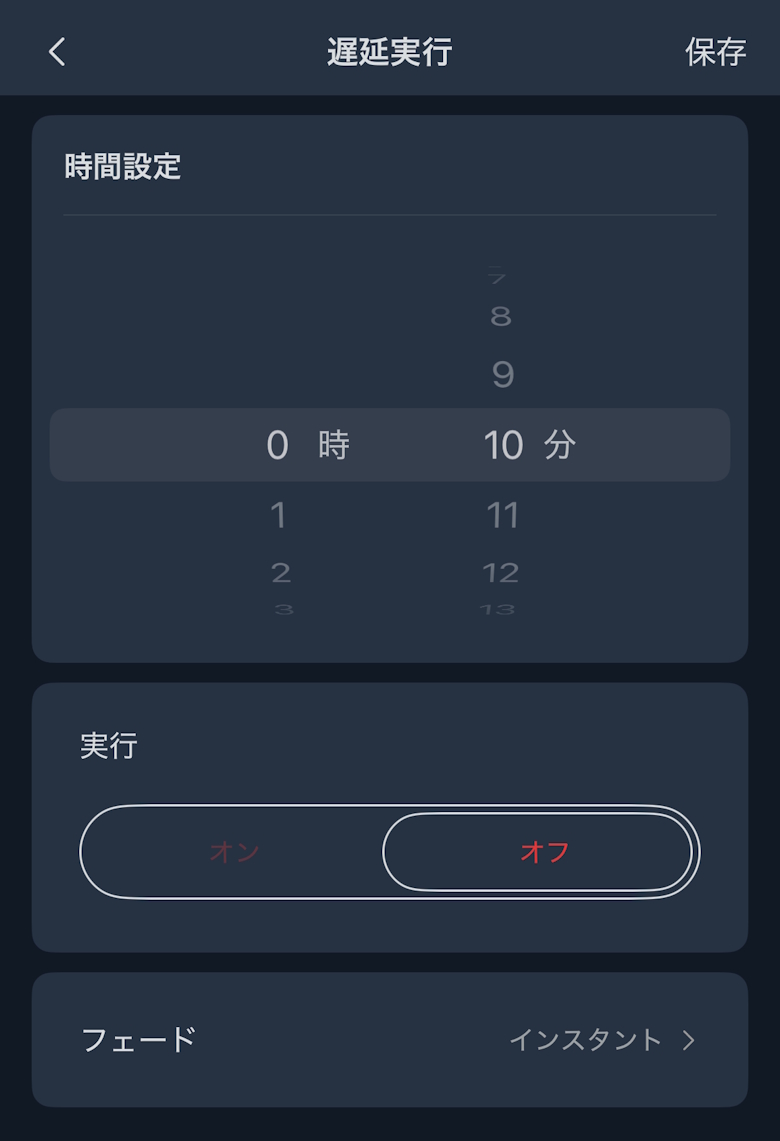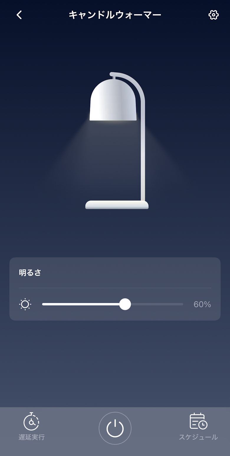 アプリのホーム画面では電源ON/OFFや調光、遅延タイマーを設定できます。