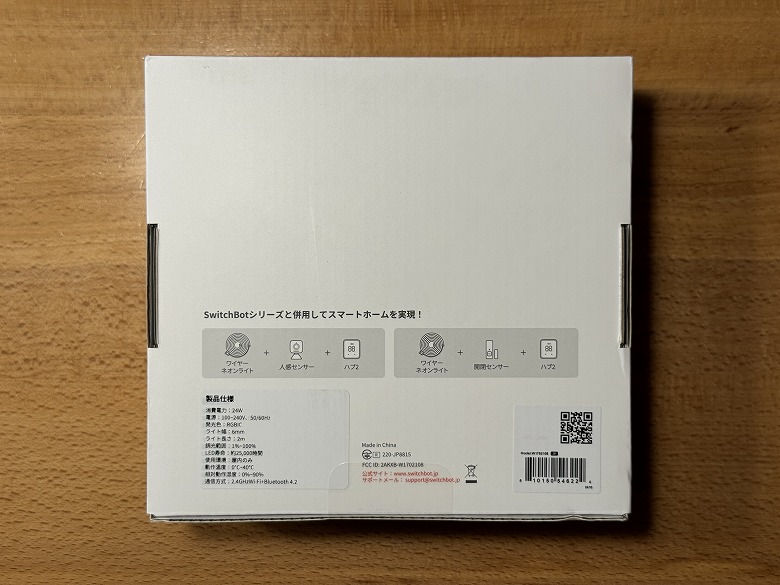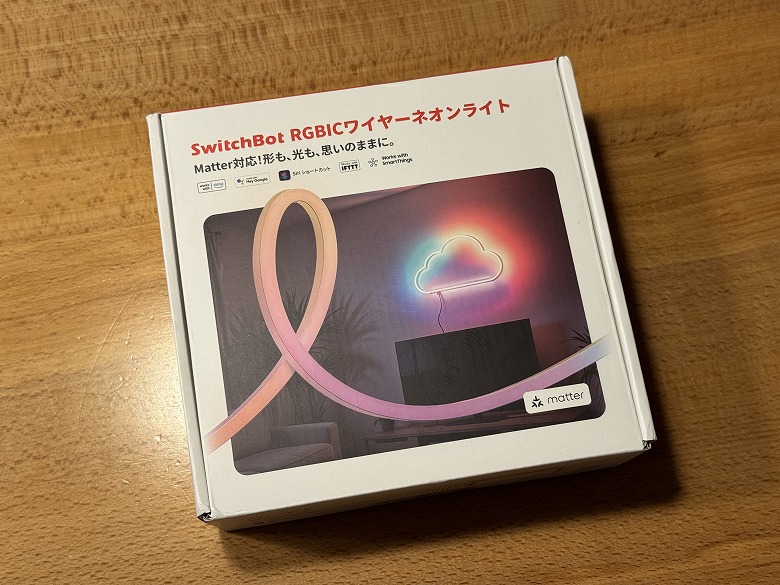 「SwitchBot RGBICワイヤーネオンライト」の外箱は、白基調でシンプルなデザインです。