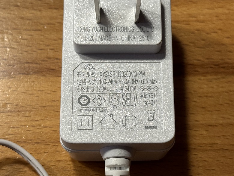電源アダプターの側面には仕様が記載されています。