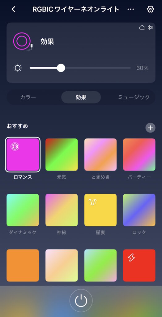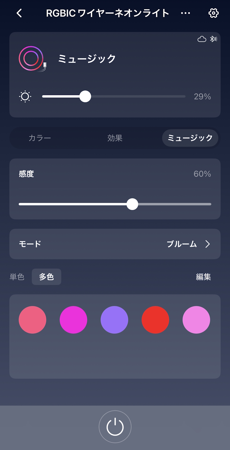 ライトの光量はもちろん、モード別にホワイト・カラー・効果・ミュージックから様々なカラーパターンを選択できます。