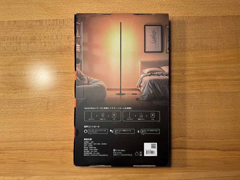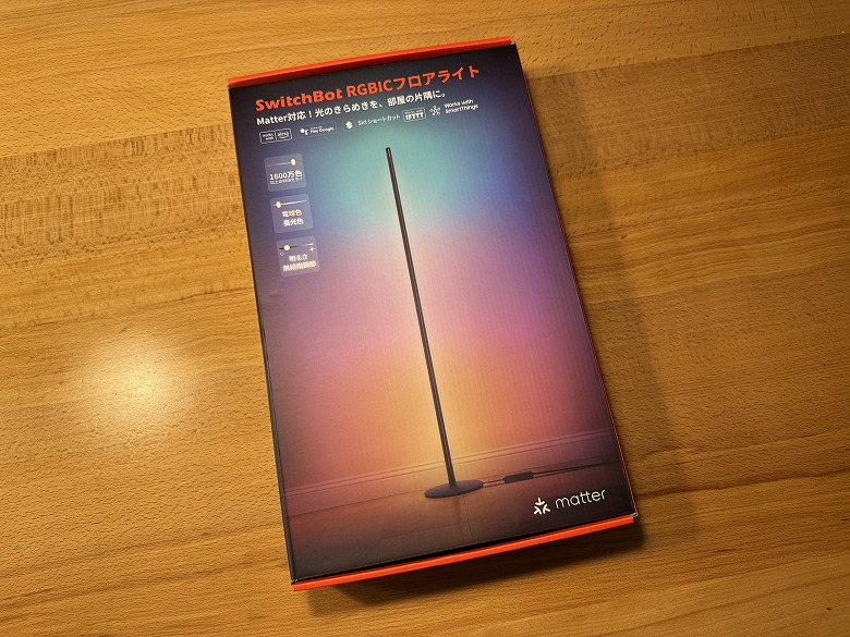 SwitchBot RGBICフロアライト」の外箱は、黒基調で赤をアクセントカラーにしたクールなデザインです。