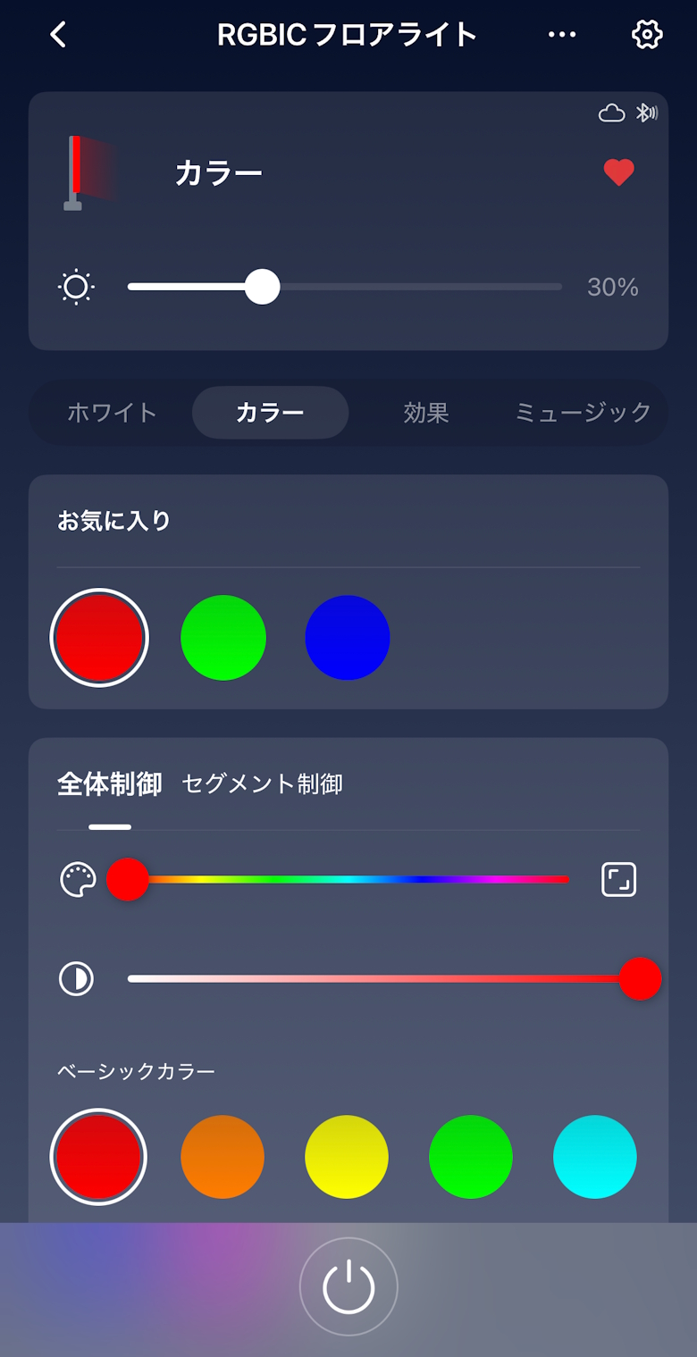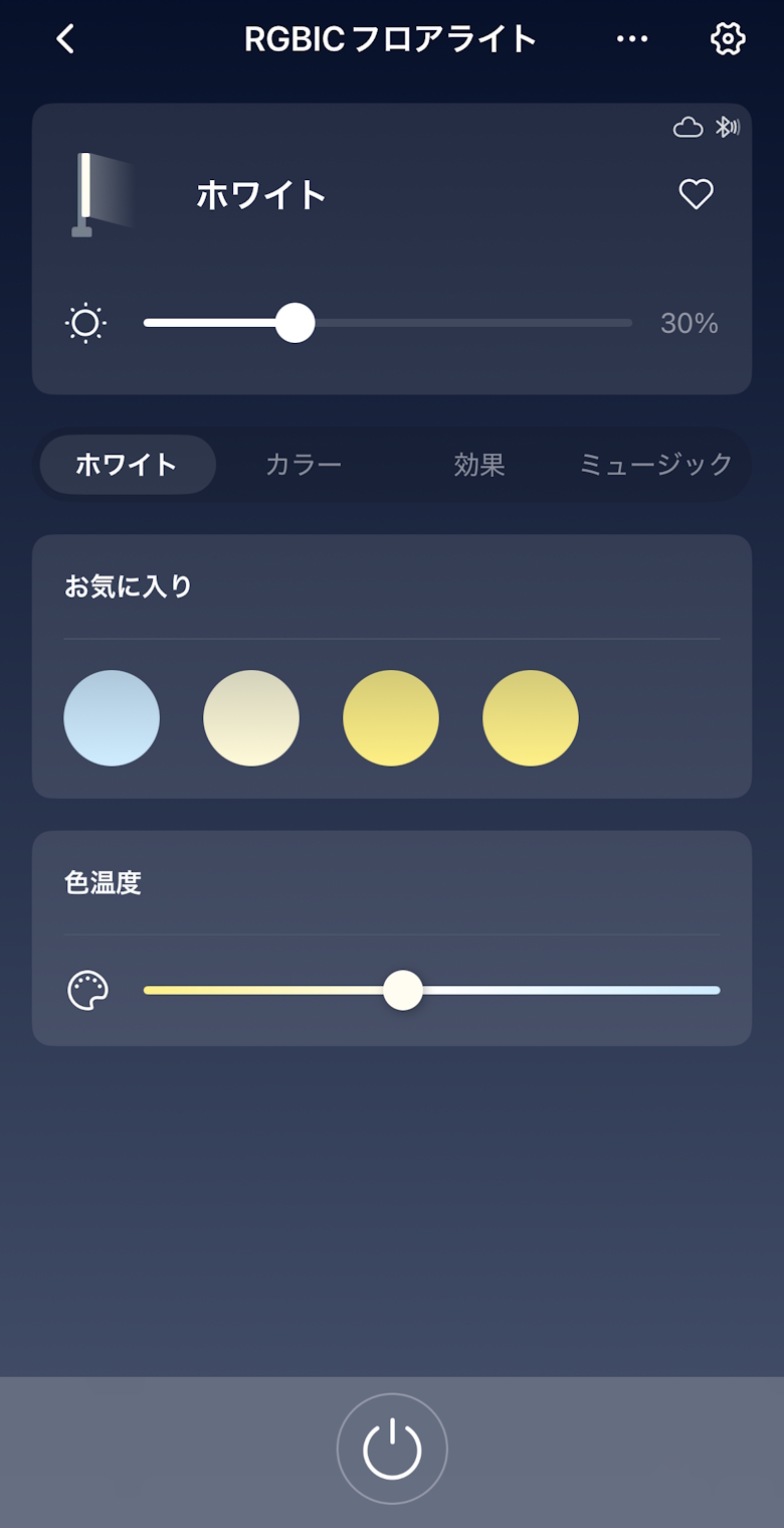 ホーム画面では電源ON/OFFと光量を調整できます。