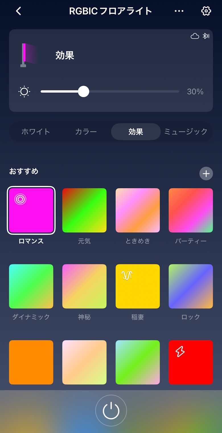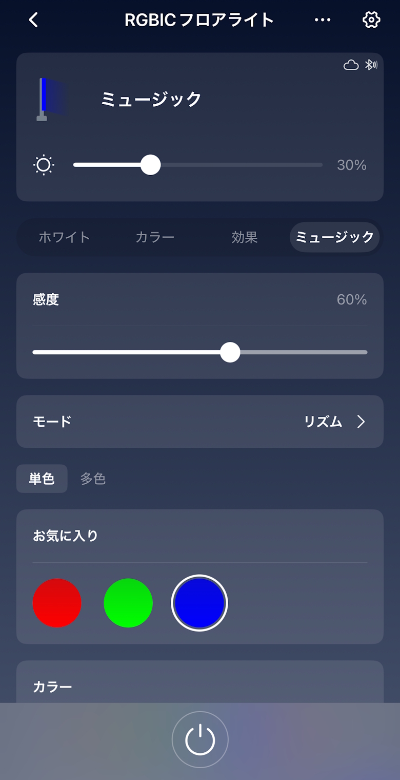 ライトの光量はもちろん、モード別にホワイト・カラー・効果・ミュージックから様々なカラーパターンを選択できます。