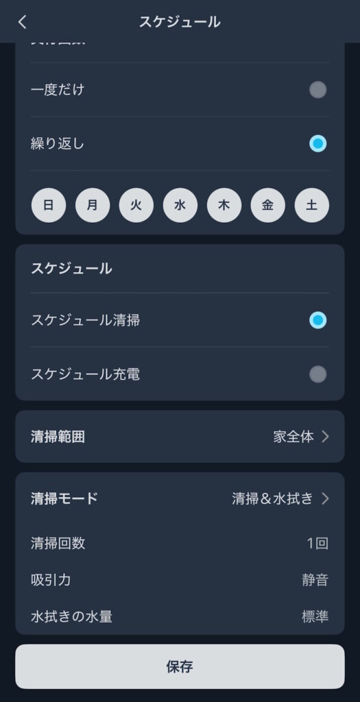 掃除は清掃&水拭き、清掃、清掃後に水拭き、カスタムから選択できます。
