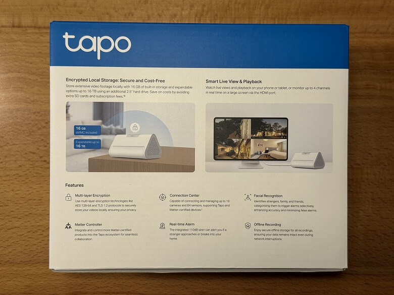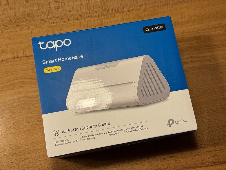 TP-Link Tapo H500」の外箱は、白基調で青をアクセントカラーにしたシンプルなデザインです。