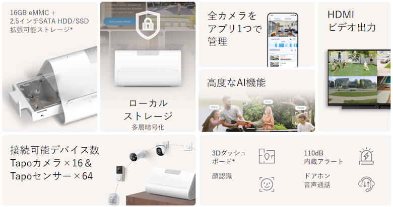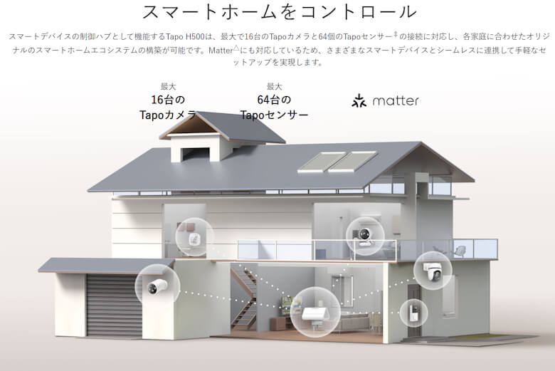 最大で16台のカメラと64個のセンサーの接続に対応し、スマートホームをコントロールできます。