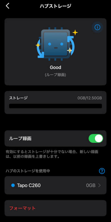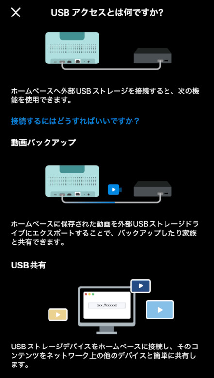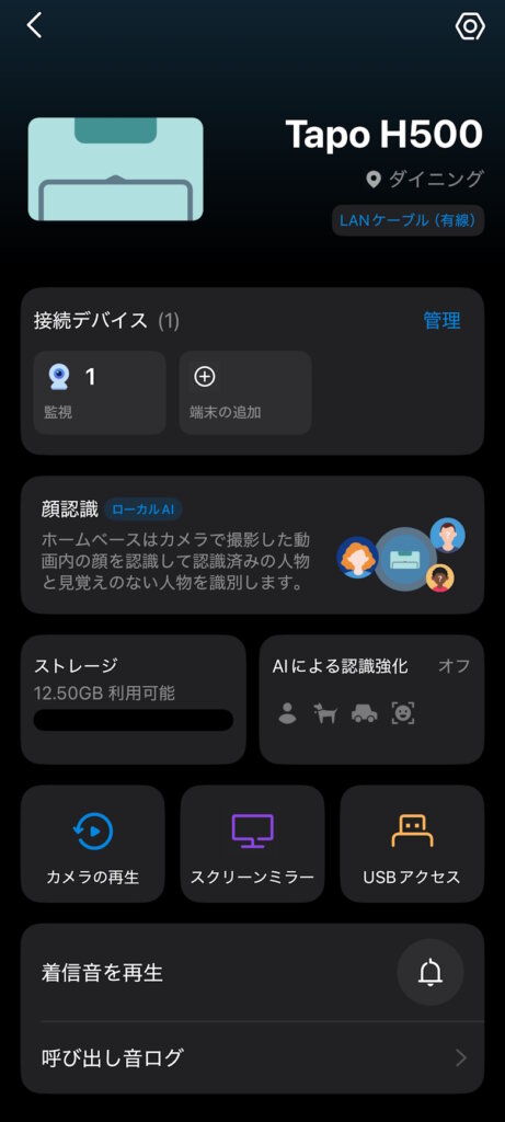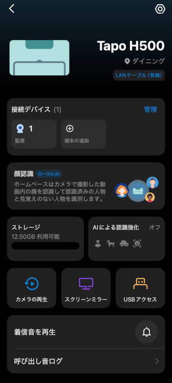 ホーム画面には接続デバイスやストレージの確認、カメラの再生ができます。