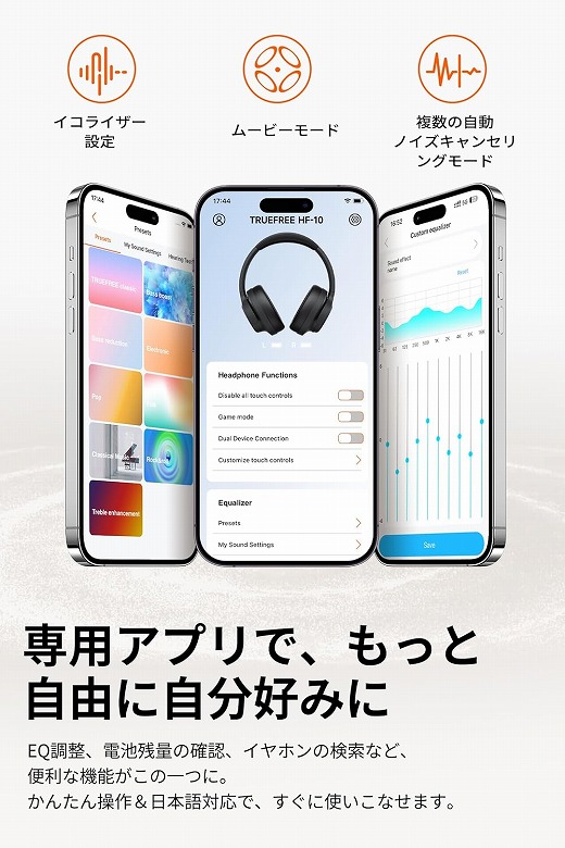 専用アプリ「TRUEFREE」で、ノイズキャンセリングモードの選択やイコライザーなどの機能を使えます。