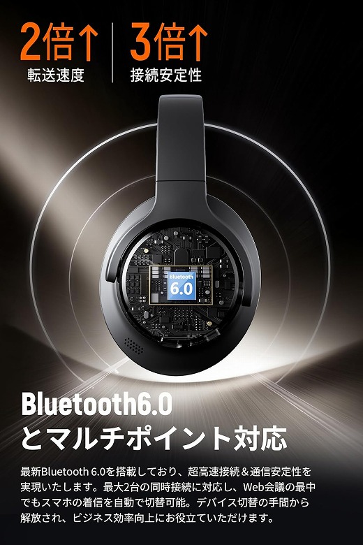 Bluetooth6.0による安定した接続に加え、マルチポイント対応でスマホとPCの切り替えもスムーズ。