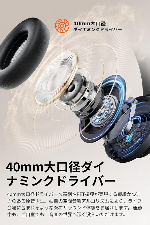 40 mm大口径ダイナミックドライバーを搭載し、繊細かつ迫力ある音楽を再生します。