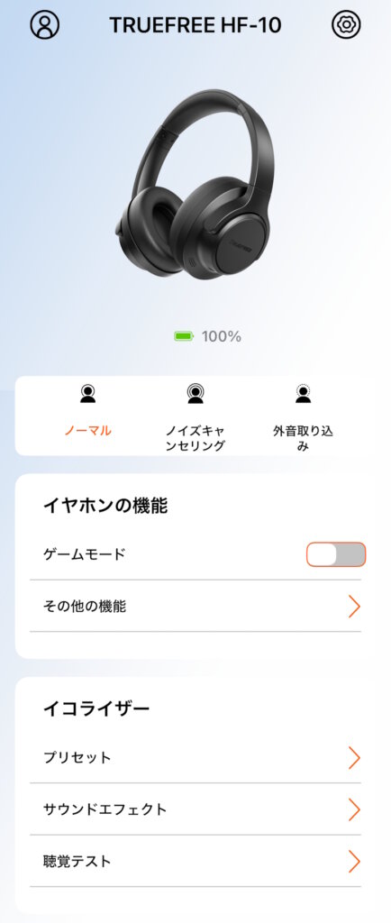 ノイズキャンセリングやゲームモード、イコライザーなど設定できます。