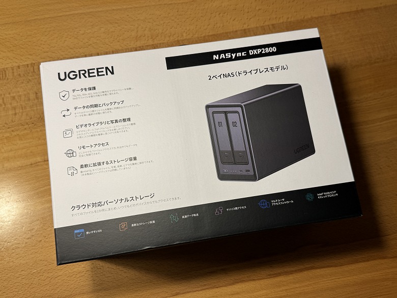 「UGREEN NASync DXP2800」の外箱は、白基調で製品の写真がプリントされたシンプルなデザインです。