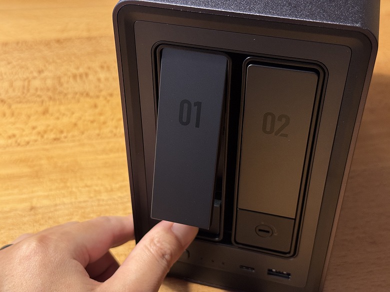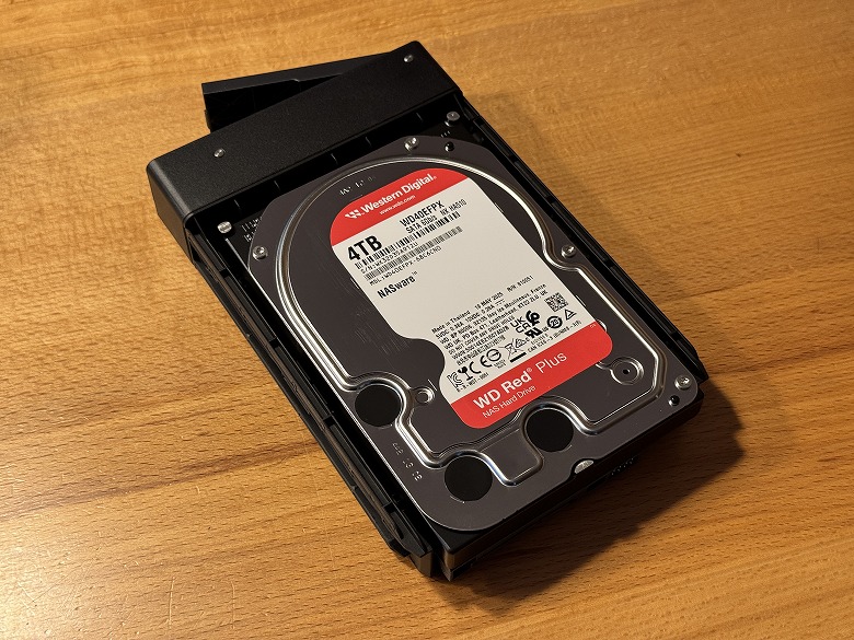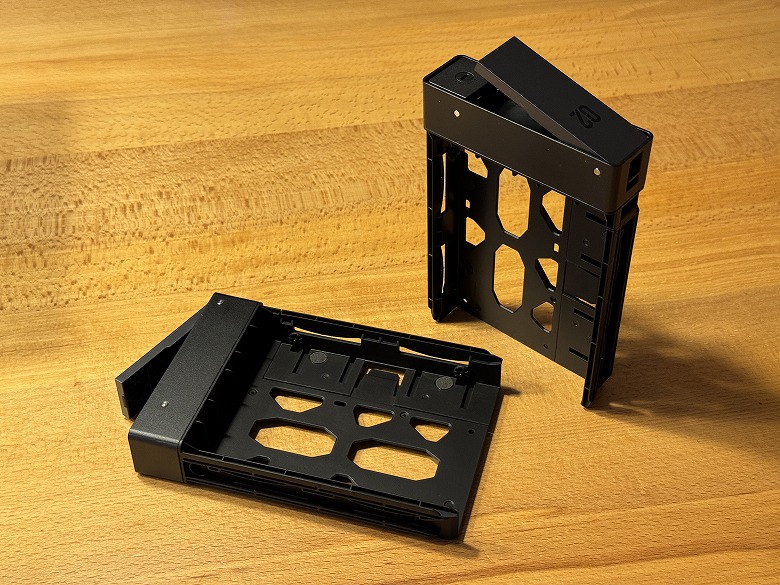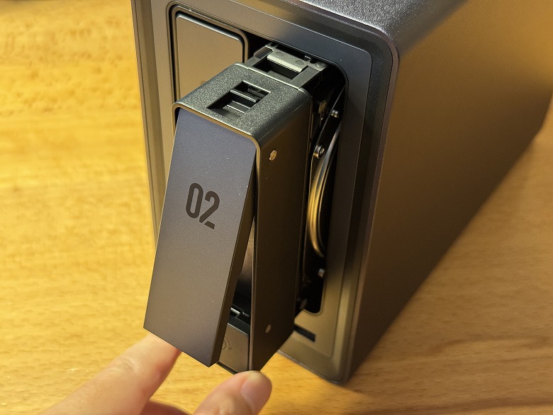 別途用意したHDDを各ドライブトレイに挟み込み(3.5インチの場合)、本体に差し込むだけで準備完了です。