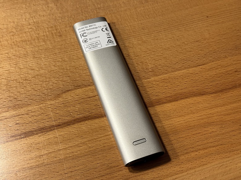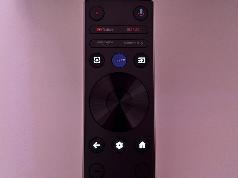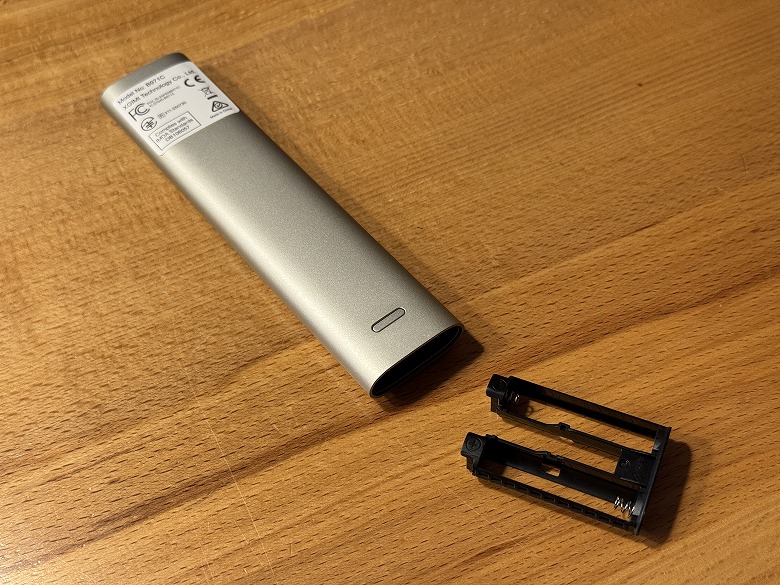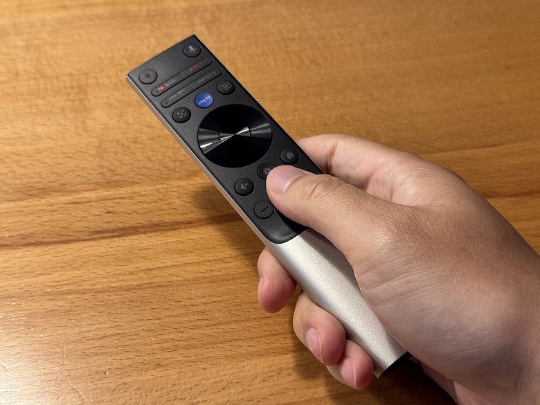 リモコンはシルバーを基調とし、ボタンにバックライトがあるので暗くても視認性が良く使えます。